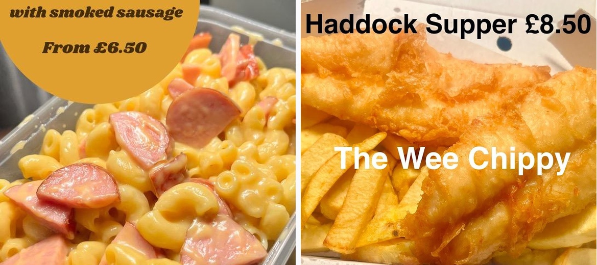 The Wee Chippy specializes in traditional fish and chips but also offers a variety of other dishes, including homemade pizzas, sausages, chicken, and light bites.